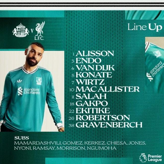 利物浦首發(fā):1-阿利松、3-遠藤航、4-范戴克、5-科納特、26-羅伯遜、38-赫拉芬貝赫、10-麥卡利斯特、7-維爾茨、11-薩拉赫、18-加克波、22-埃基蒂克