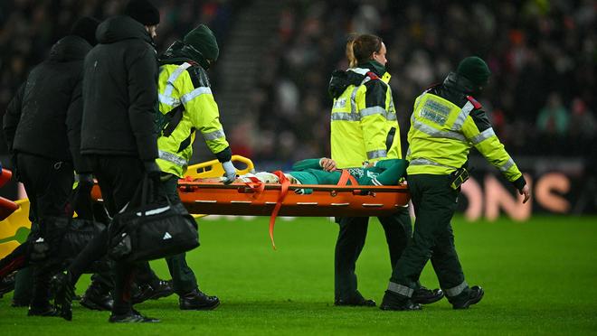 比賽中,遠藤航試圖解圍左側傳中時,左腳被草皮絆倒,導致左踝關節嚴重扭傷,之后他被擔架抬下球場,下場時,遠藤航捂著面部,看上去受傷非常嚴重。