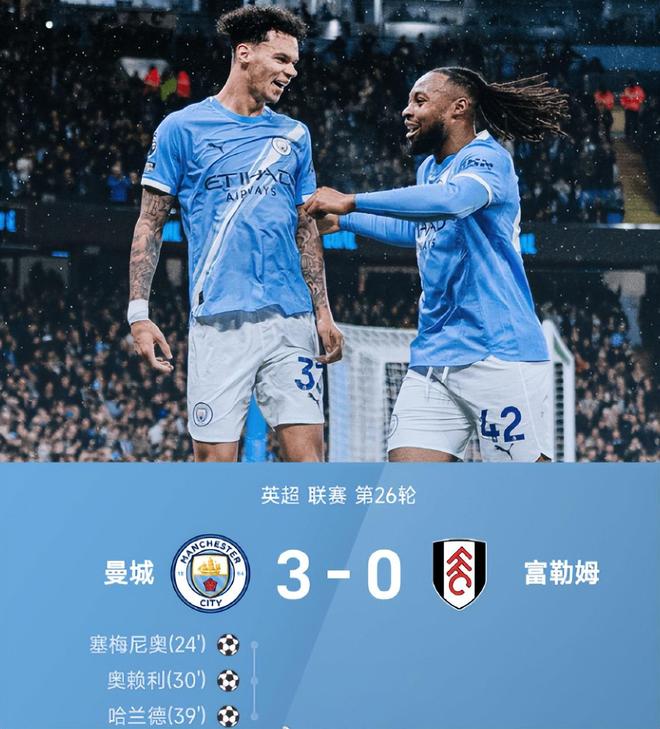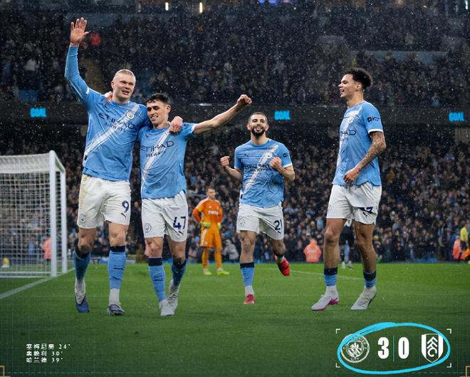 英超第26輪曼城坐鎮主場以3-0橫掃富勒姆,將與榜首阿森納的分差縮小至3分,隨后槍手爆冷失分,曼城就有可能取而代之。此役,上半場塞梅尼奧傳射建功,奧賴利、哈蘭德先后破門,藍月亮早早鎖定勝局。下半場富勒姆雖竭力反撲卻難破曼城防御的銅墻鐵壁,最終瓜帥的球隊贏球的同時將兩項英超歷史紀錄收入囊中。