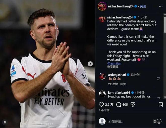 賽后菲爾克魯格更新社媒,談到了自己的想法,并感謝了球迷的支持。
