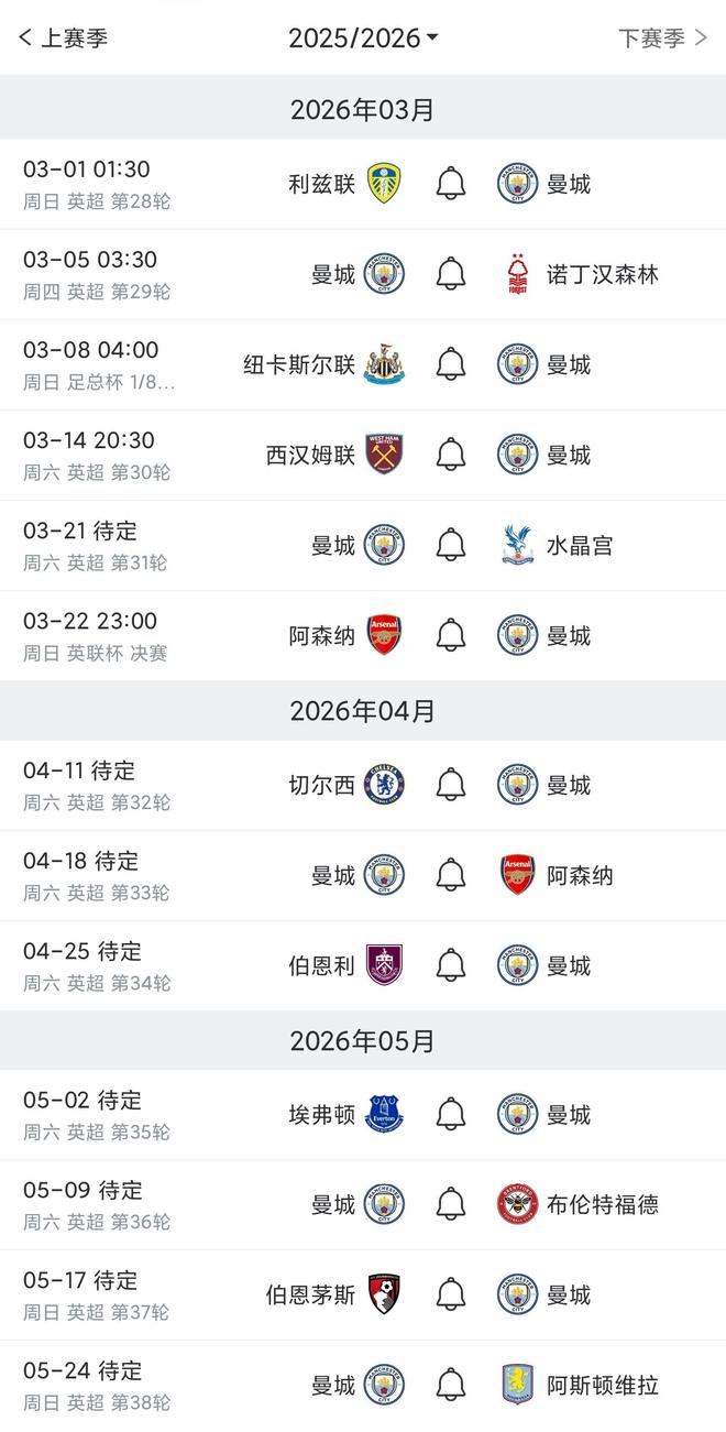曼城剩余英超賽程