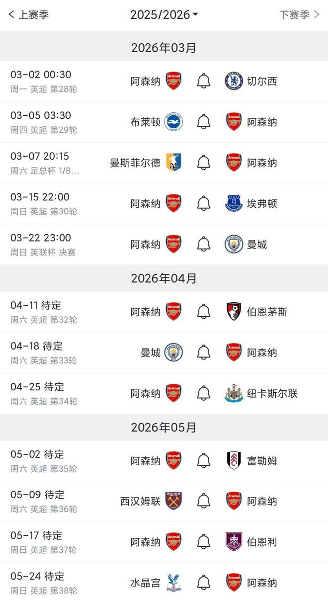 阿森納剩余英超賽程