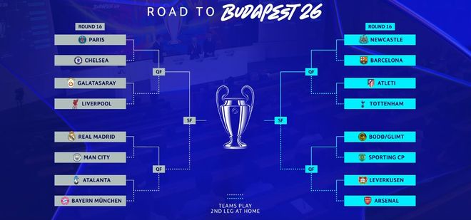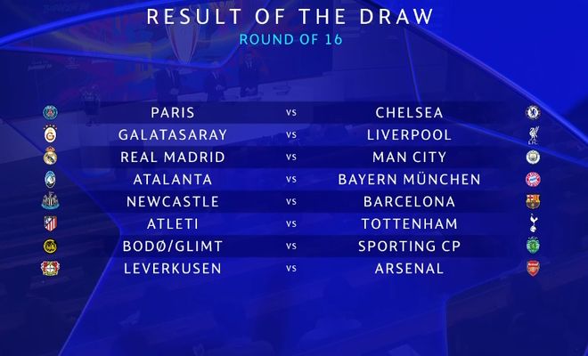 經過2天比賽的爭奪,本賽季歐冠淘汰賽附加賽已經結束了全部比賽的角逐;馬競、博德閃耀、勒沃庫森、紐卡、亞特蘭大、大巴黎、皇馬、加拉塔薩雷在內的八家俱樂部擊敗了各自的對手,成功躋身淘汰賽。與此前獲得前八的8隊組成了本賽季的歐冠16強;北京時間2月27日晚,歐冠淘汰賽抽簽儀式在瑞士尼翁的歐足聯總部進行,經過抽簽之后,誕生了皇馬VS曼城、大巴黎VS切爾西、巴薩VS紐卡斯爾3組重磅對決。