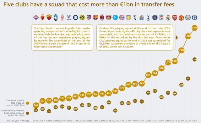 歐洲足壇目前共有5家10億俱樂部,英超占2025財年末身價排名前10的球隊中的7支。上榜的25家俱樂部中有16家刷新了俱樂部歷史最高紀錄。切爾西在2025財年末的陣容身價再次創下新高,總轉會費高達17.46億歐元,比他們去年創下的紀錄高出9000萬。