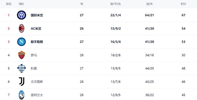 在積分榜上,國(guó)際米蘭以絕對(duì)優(yōu)勢(shì)占據(jù)榜首位置。國(guó)際米蘭22勝1平4負(fù),拿到67分。而排名第2的AC米蘭只拿到54分,足足落后國(guó)際米蘭13分。這樣的差距太驚人了。顯然,國(guó)際米蘭已經(jīng)無(wú)限接近冠軍了。那不勒斯贏球之后,總積分達(dá)到53分,排名第3。第4的是羅馬,拿到50分。科莫贏球之后,總積分達(dá)到48分,超越了尤文圖斯,升到第5名。而只拿到46分的尤文圖斯掉到第6名。