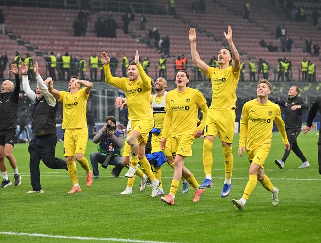2月24日,博德閃耀隊(duì)球員在本賽季歐冠淘汰賽附加賽戰(zhàn)勝國際米蘭隊(duì)后慶祝。新華社發(fā)