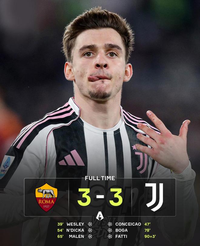 比賽進入最后階段,尤文越戰越勇,壓力全部壓向主隊防線。補時階段,加蒂抓住混亂機會完成絕平,3-3!從1-3到3-3,尤文硬生生從深淵爬回來。羅馬到手的三分飛走,只能接受苦澀平局。