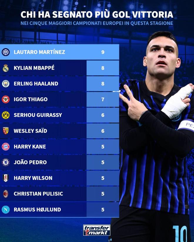 北京時間3月6日,德轉統計出了本賽季歐洲五大聯賽球員制勝球進球榜,勞塔羅9球第一,姆巴佩、哈蘭德8球并列第二。