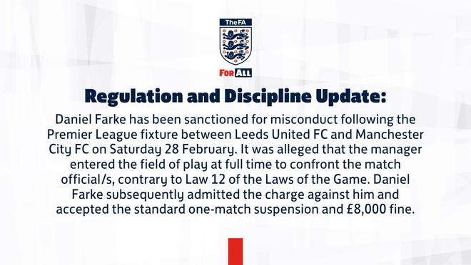 丹尼爾-法爾克因在2月28日利茲聯與曼城的英超比賽后行為不當而受到處罰,據稱,這位教練在比賽結束時進入場地與比賽官員對峙。