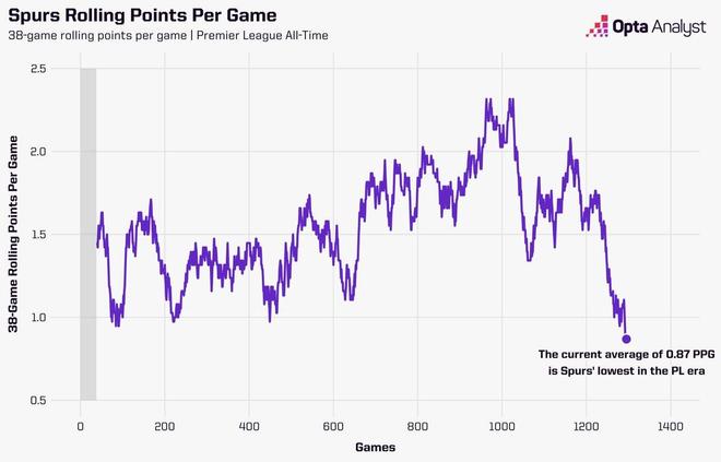 據統計,托特納姆熱刺在最近38場英超比賽中只拿到了33分,這相當于場均僅0.87分。