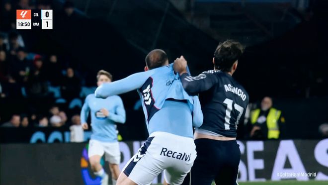 第71分鐘,比賽爭議的一幕出現,尤特格拉禁區明顯的手球,但是裁判認為楚阿梅尼推搡在先,因此拒絕吹罰點球。第87分鐘,塞爾塔快速發動反擊,替補登場的阿斯帕斯晃過阿森西奧,勁射遠角擊中橫梁彈出!皇馬逃過一劫。補時階段的最后一分鐘,巴爾韋德禁區外的一腳勁射,擊中對手產生折射破門,2:1!皇馬完成絕殺!