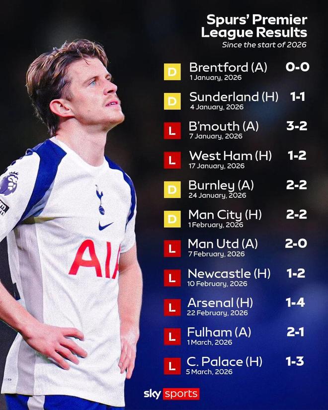 周四晚1比3輸給水晶宮后,英超11場不勝兼5連敗的熱刺,在29輪后僅積29分排名第16位,距離降級區1分。而118天前,主場逼平曼聯的熱刺還在第5位的歐冠區。10年前熱刺英超奪冠賠率是7/2,如今降級賠率是9/2幾乎相當。2月13日圖多爾接替弗蘭克,非但沒有止住熱刺的自由落體,還以3連敗讓降級形勢繼續惡化。目前11場聯賽不勝的熱刺,隊史成績僅好于1935年(15場聯賽不勝)。自1977年以來,熱刺又一次不得不面對從英格蘭頂級聯賽降級可能的嚴峻危機。