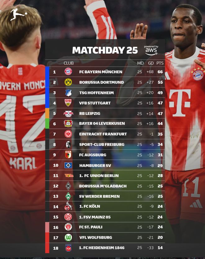 北京時間3月9日凌晨,云達不萊梅4比1大勝柏林聯合,德甲聯賽第25輪全部結束。積分榜方面,拜仁4比1大勝門興,繼續以11分的優勢領跑;多特小勝科隆,沒有讓分差繼續擴大;霍芬海姆4比2擊敗海登海姆仍列第三,與本輪憾平的斯圖加特拉開了兩分分差;RB萊比錫2比1擊敗奧格斯堡,積47分追平斯圖加特,僅以凈勝球劣勢排名第五,勒沃庫森積44分。