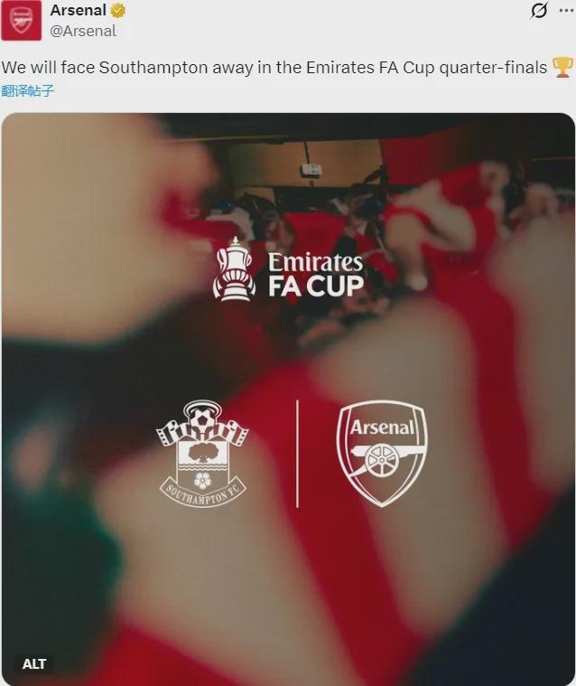 官方:阿森納在足總杯四分之一決賽中抽到了南安普頓,槍手將客場作戰。